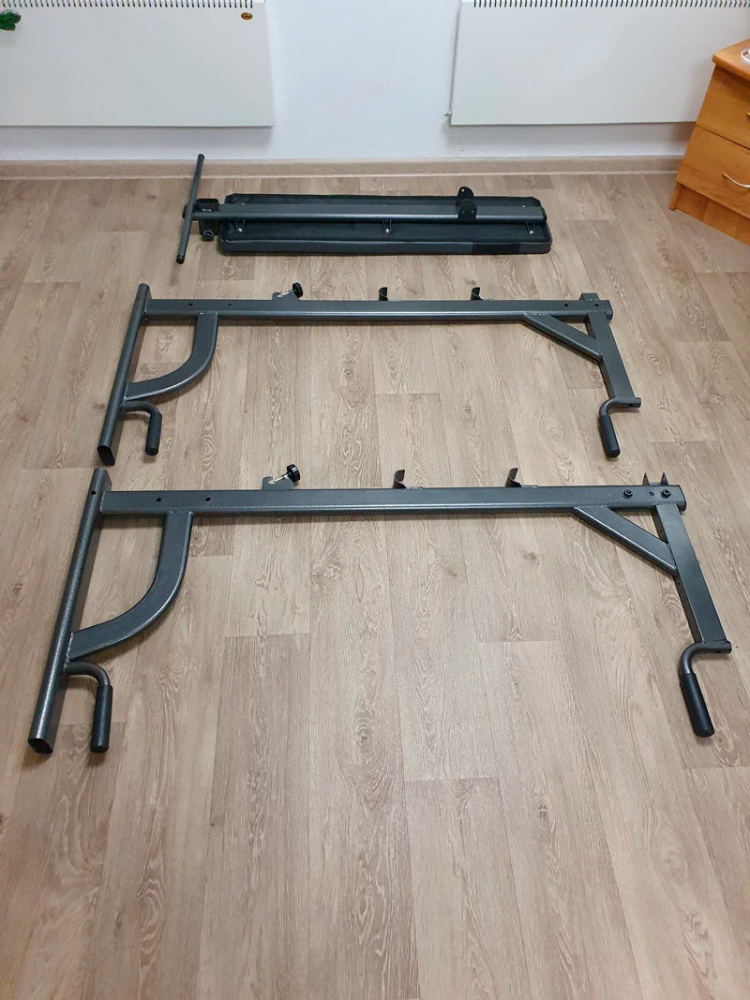 Турник регулируется по высоте от 180 до 230 см, промежуточная фиксация с помощью 4 болтов с ручками.